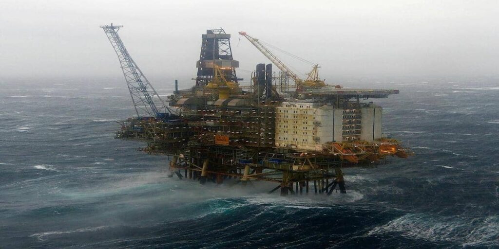 A run-down oil rig in the North Sea, off the coast of the United Kingdom.